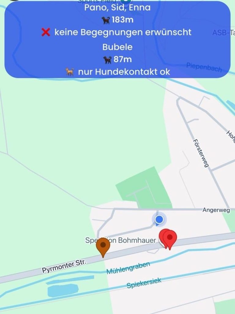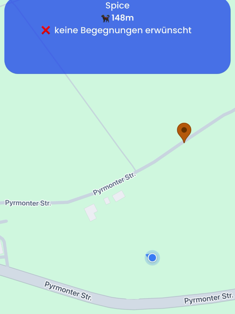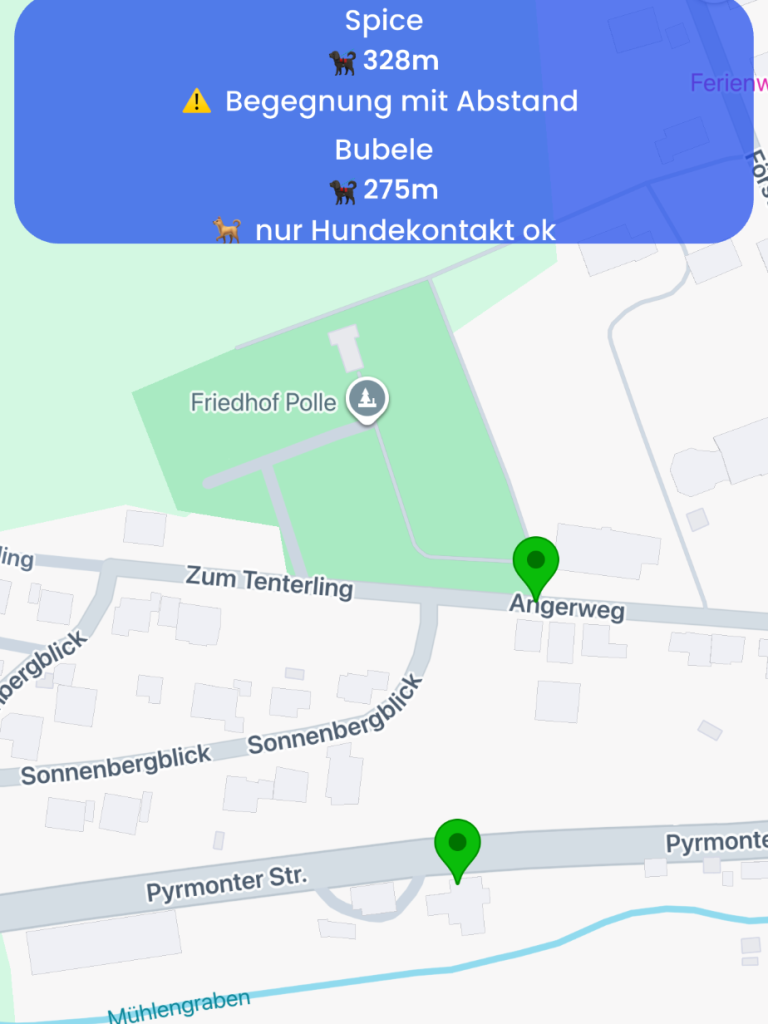 Siehe in Echtzeit, wie nah andere Hundeteams sind - und entscheide selbst, wann du eine Begegnung möchtest.